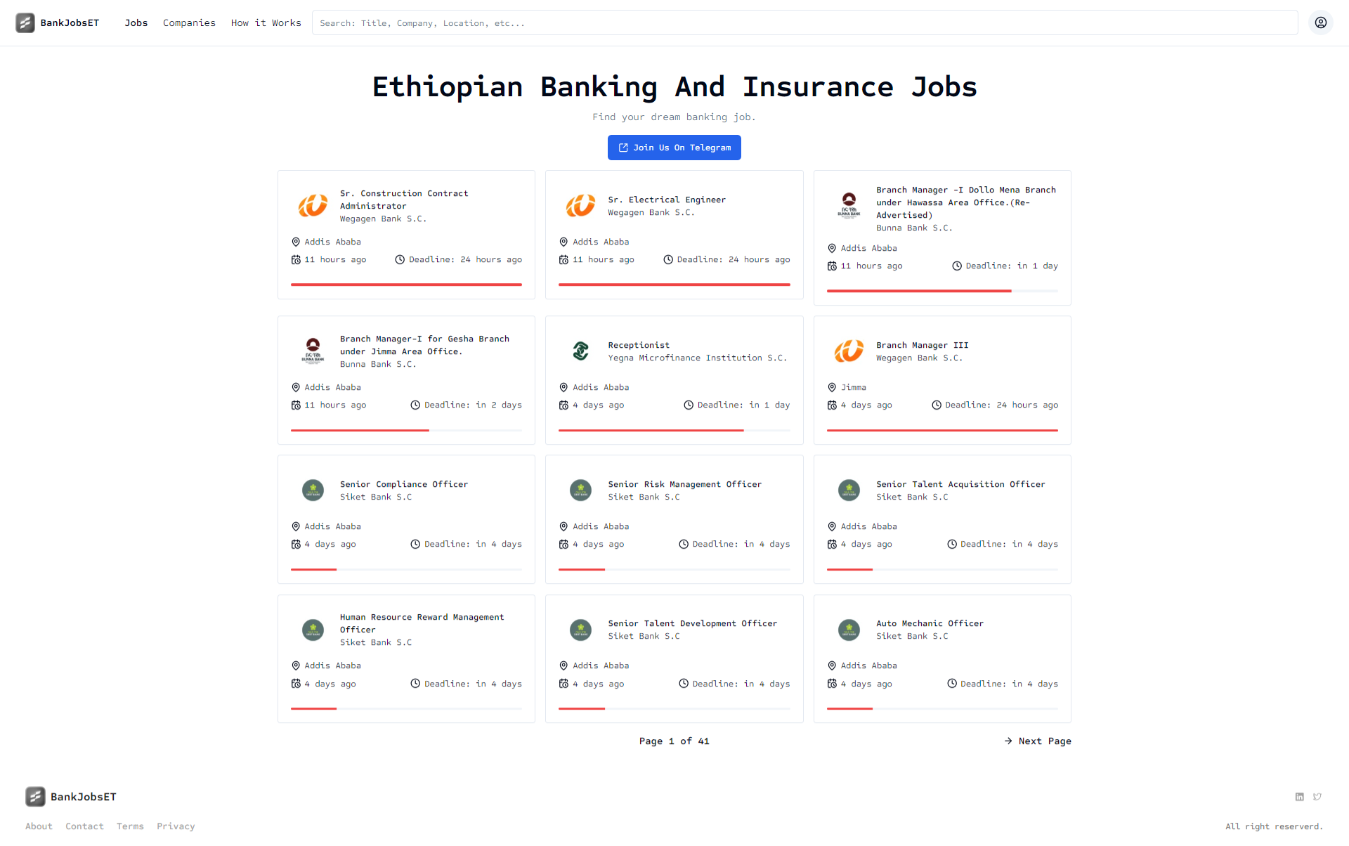At BankJobsET, we are your ultimate destination for embarking on a successful and rewarding journey in the world of finance. Whether you're looking to explore opportunities in esteemed banks, insurance firms, or micro-finance institutions, we are here to guide you every step of the way.